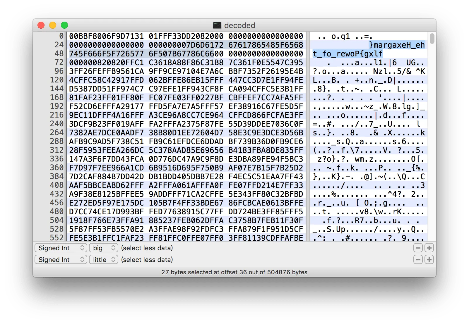 我也寫了一個粗糙的 Python 程序[11]來轉譯這個文件中的卦名到二進制數據,在輸出時反轉了文件的順序,這樣在頭部附近就可以找到 Flxg(Flag)。