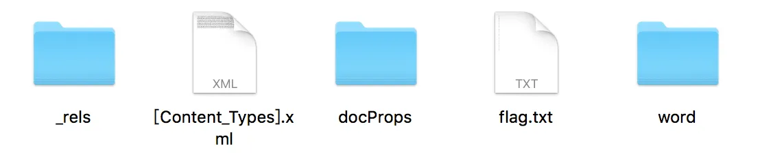 下載到的是名爲 OfficeOpenXML.docx 的文件,可以在 Office 中打開,文檔表面看只是維基百科 Office Open XML 條目[5]中的內容 ,我無趣的用某個 Hex editor 在文件中尋找了一下包含 flag 的字符串,發現了 flag.txt。既然這個形似文件名東西被找到了,就直接解壓好了,得到 Flag。