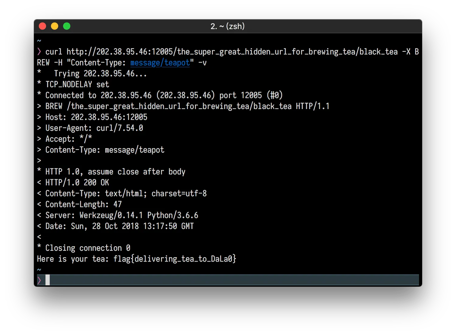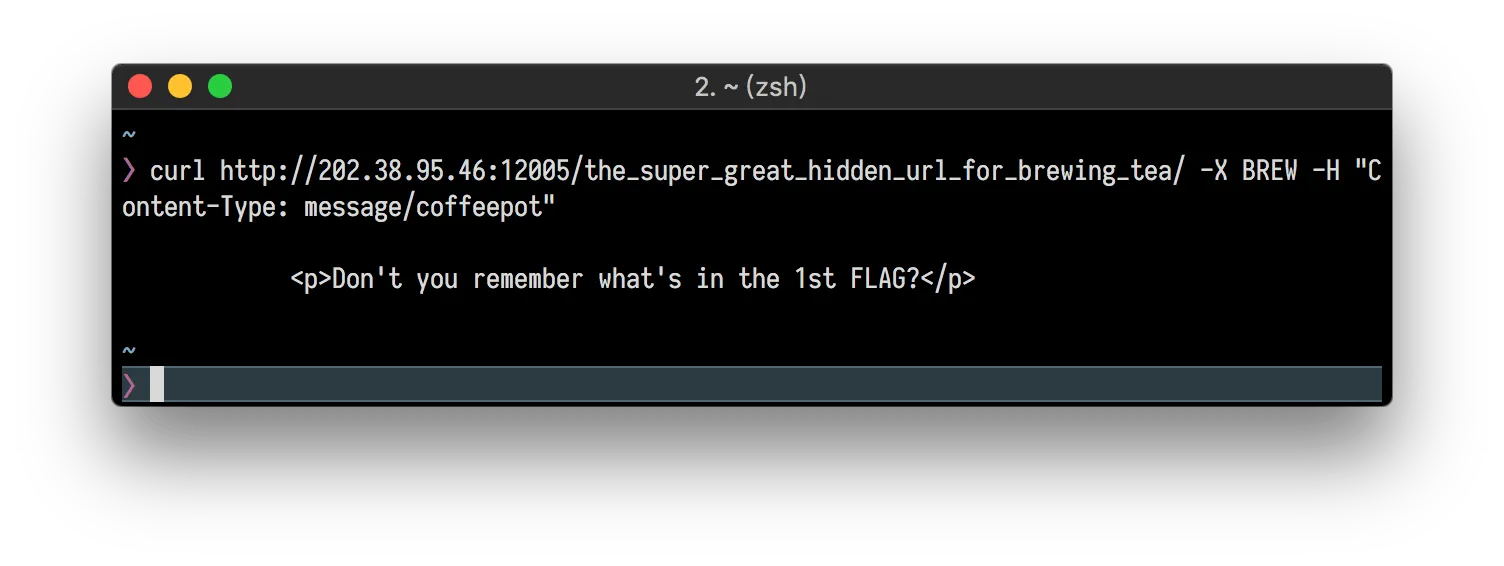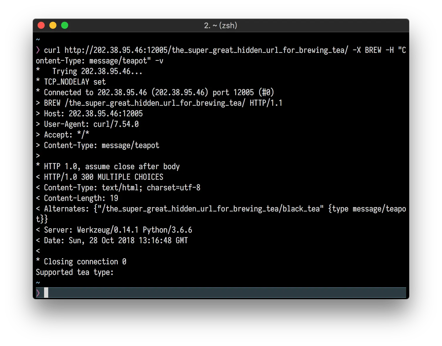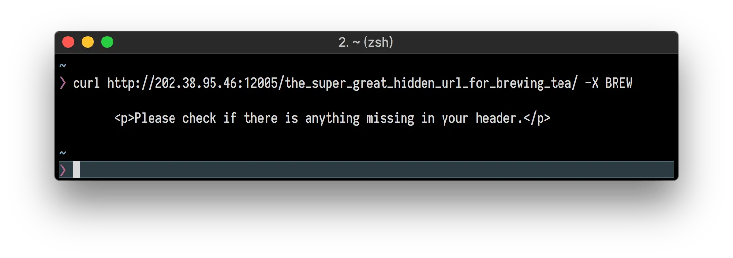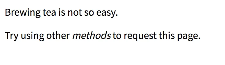 其他 Methods,看來直接 GET 還是太天真了。想到這裏,我們還要考慮到這個小傢伙可能是個茶壺,我們是不是應該用…… BREW 方法來請求它呢?畢竟上文的 RFC 2324 中也有提到過這個方法。